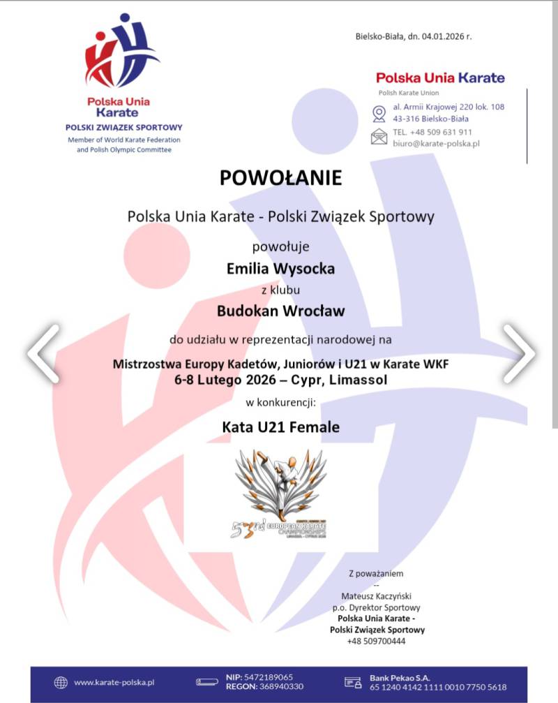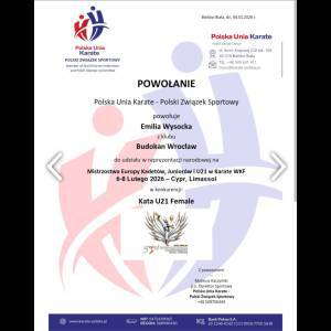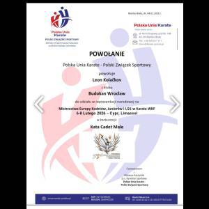 Karatecy trenujący na co dzień pod okiem trenera Bogusława Boczniewicza w średzkiej sekcji Budokanu Wrocław – Emilia Wysocka, Milena Żurek i Leon Kolackov – zostali powołani do Kadry Narodowej Polskiej Unii Karate na Mistrzostwa Europy Kadetów, Juniorów i U21 Karate WKF, które odbędą się w dniach 6–8.02.2026 r. w Limassol na Cyprze.