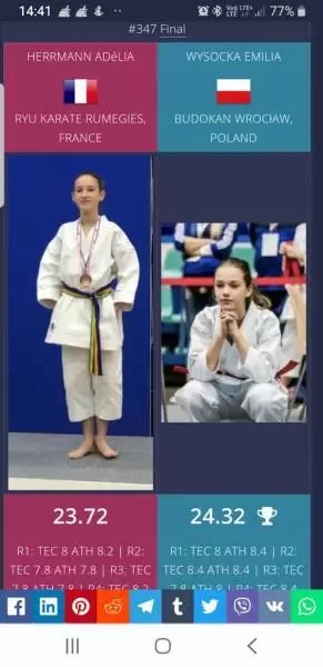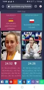 Emilka zajęła 1. miejsce w Kata U-14 oraz 2. miejsce w kata U-16. Dzięki tym sukcesom plasuje się na 3. miejscu w rankingu światowym w kategorii U-14 na 192 sklasyfikowane zawodniczki oraz na miejscu 6. w kategorii U-16 na 188 zawodniczek.
