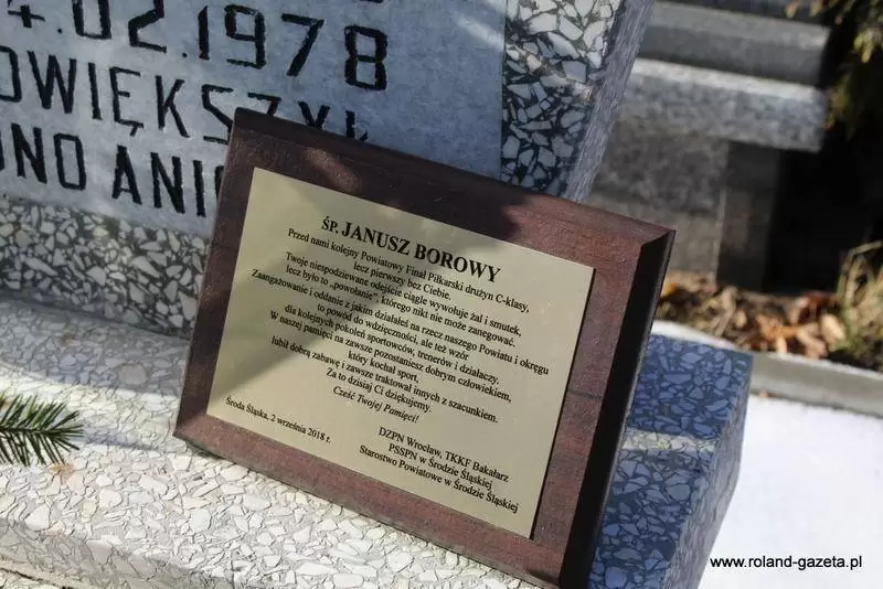 „Przed nami kolejne Powiatowy Finał Piłkarski drużyn C-klasy, lecz pierwszy bez Ciebie. Twoje niespodziewane odejście ciągle wywołuje żal i smutek, lecz było to „powołanie”, którego nikt nie może zanegować. Zaangażowanie i oddanie z jakim działałeś na rzecz naszego Powiatu o okręgu to powód do wdzięczności, ale też wzór dla kolejnych pokoleń sportowców, trenerów i działaczy. W naszej pamięci na zawsze pozostaniesz dobrym człowiekiem, który kochał sport, lubił dobrą zabawę i zawsze traktował innych z szacunkiem. Za to dzisiaj Ci dziękujemy” czytamy na tabliczce pozostawionej na nagrobku, a podpisanej przez: DZPN Wrocław, TKKF Bakałarz, PSSPN w Środzie Śląskiej, Starostwo Powiatowej w Środzie Śląskiej.