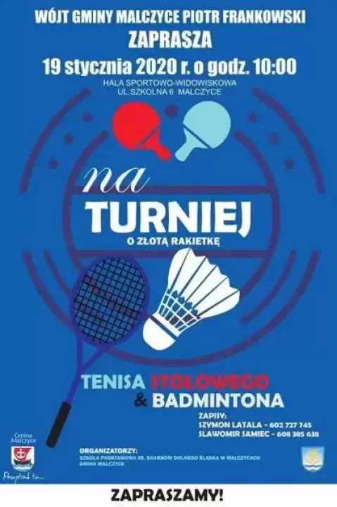 Organizatorzy - gmina Malczyce oraz Szkoła Podstawowa im. Skarbów Dolnego Śląska w Malczycach, zapraszają na Turniej Tenisa Stołowego i Badmintona o Złotą Rakietkę.
