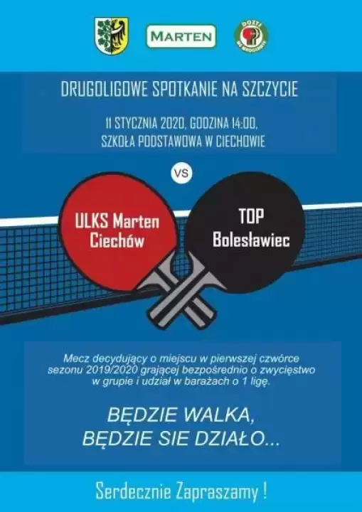 11 stycznia o godzinie 14:00 w Szkole Podstawowej w Ciechowie odbędzie się "drugoligowe spotkanie na szczycie" czyli miecz ULKS Marten Ciechów vs Top Bolesłwiec.